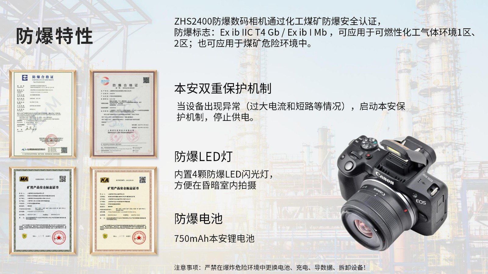 特别注意事项 | 严禁在危险气体环境下充电、导出数据和拆卸设备。使用拜特尔的防爆数码相机,必须使用本公司提供的相关配套外接设备。 |