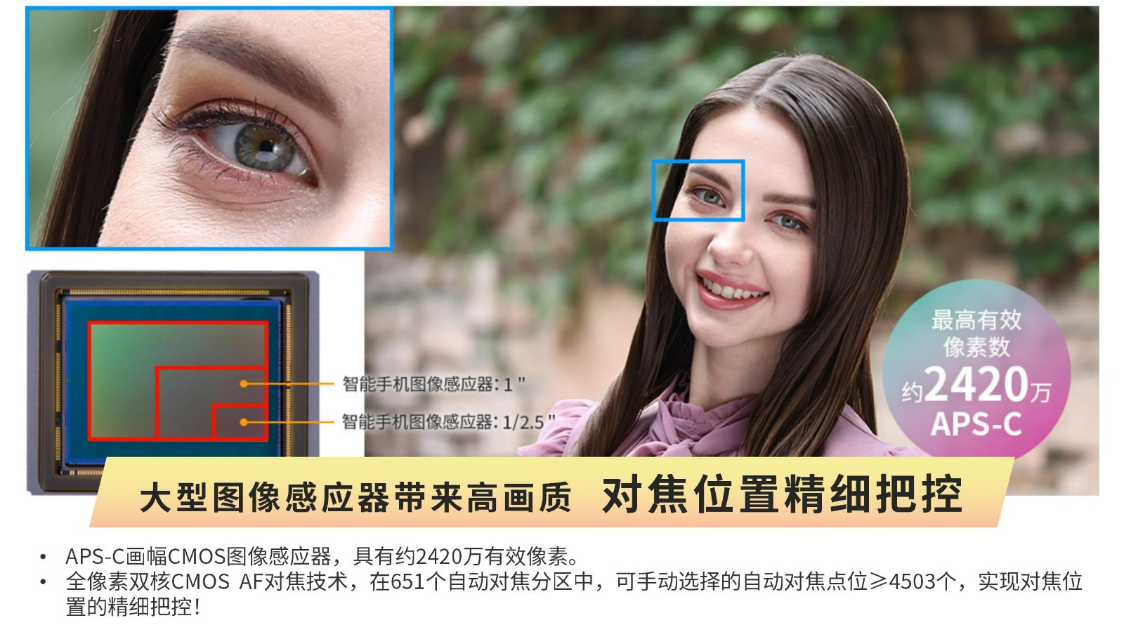 全像素双核CMOS AF对焦技术,在651个自动对焦分区中,可手动选择的自动对焦点位≥4503个,实现对焦位置的精细把控!