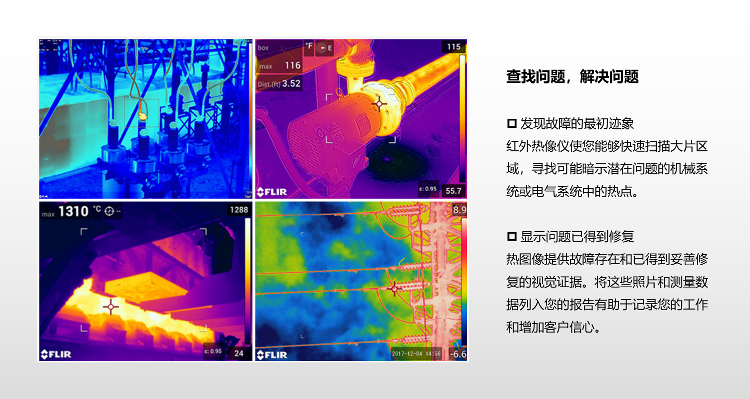 依靠红外热像仪和测试与测量工具检测和排除机械设备和电气系统故障,进行可靠的预防性维修。这些工具使技术人员能够安全地检测带电设备——甚至在高峰运行时,排除故障,助于优化生产过程和监测质量控制过程。