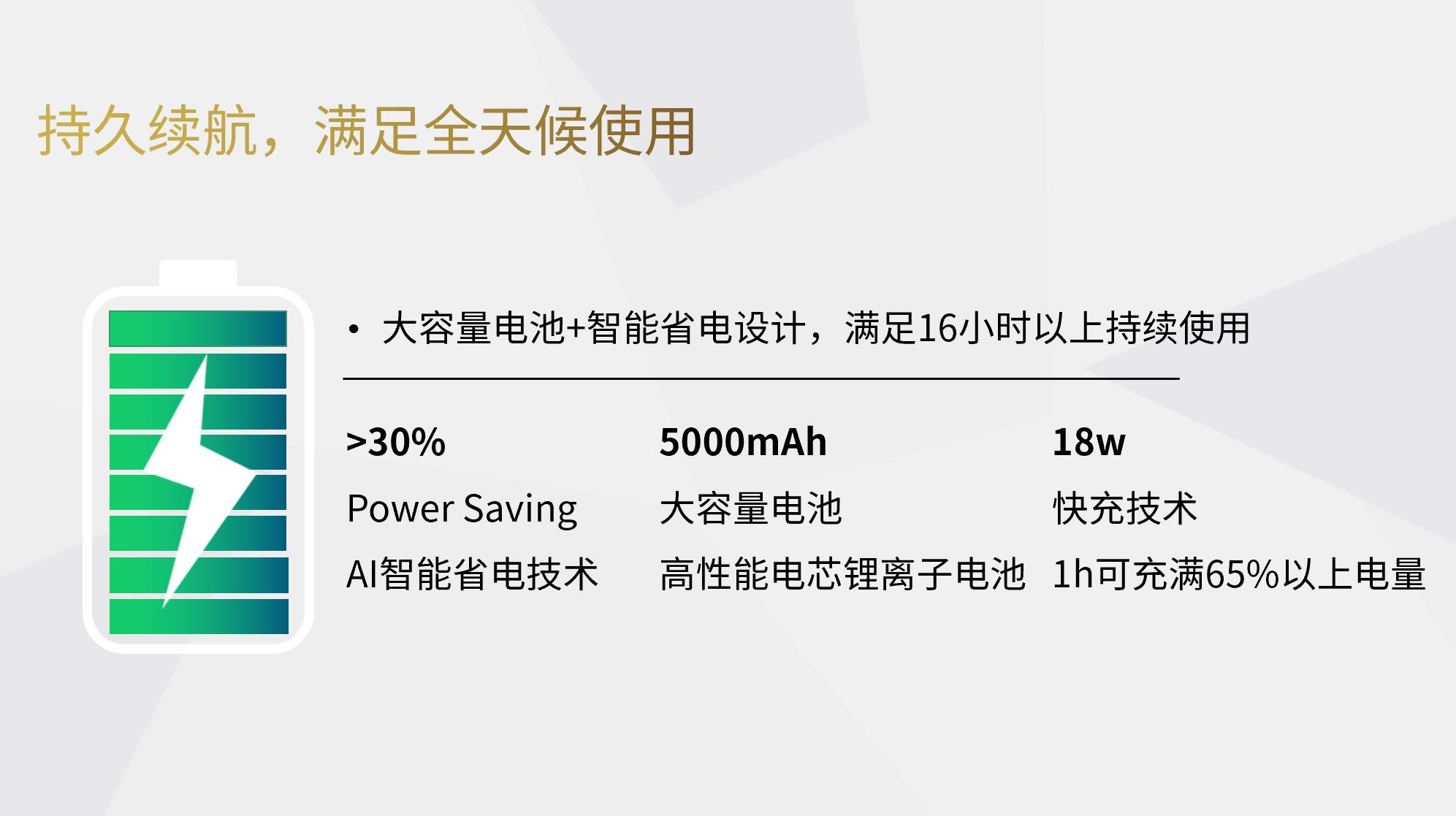 5000mAh大容量电池+智能省电设计,满足16小时以上持续使用。