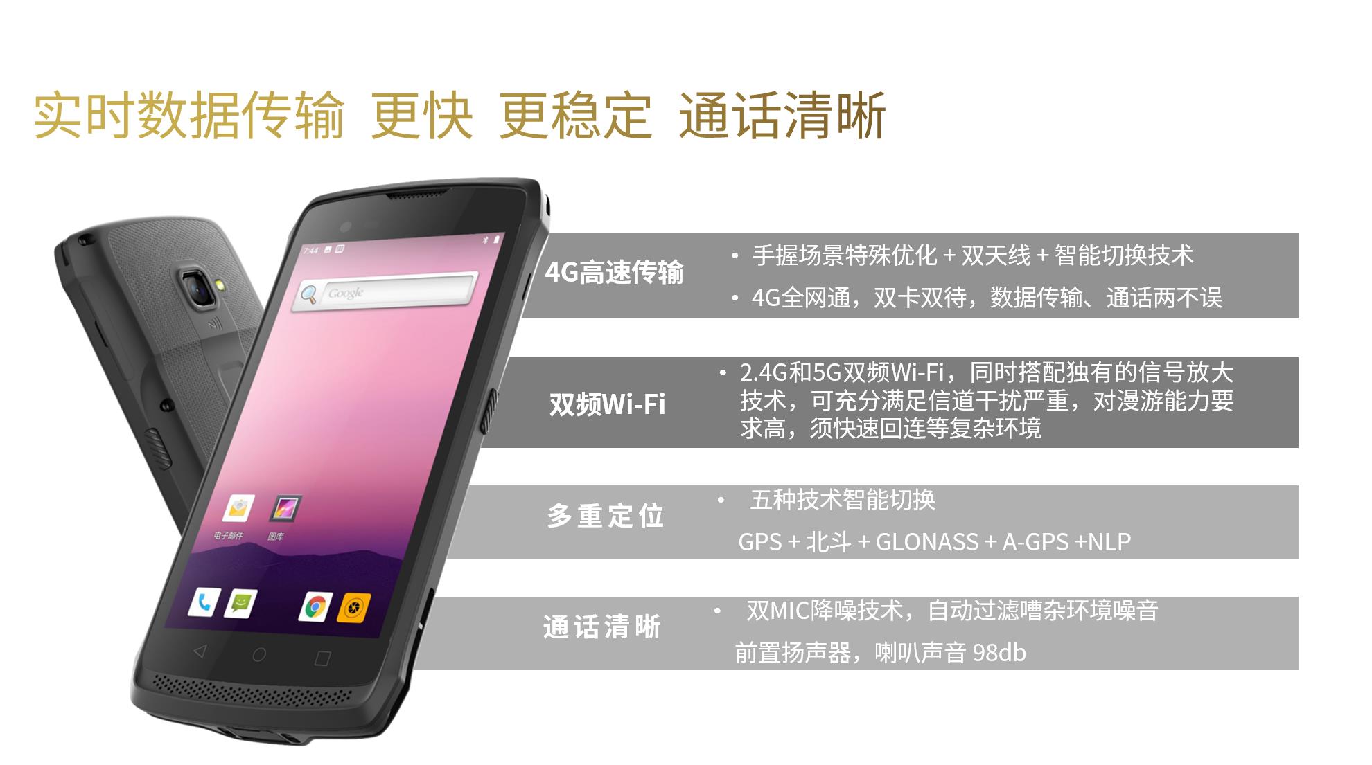 4G全网通,双频Wi-Fi,实时数据传输 ,更快、更稳定、通话清晰;