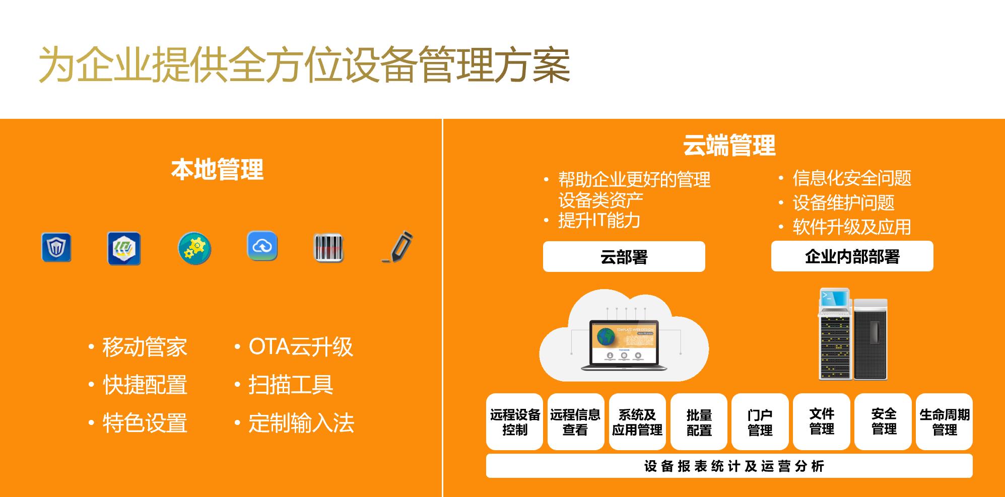 为企业提供全方位设备管理方案,包括本地管理和云端管理。