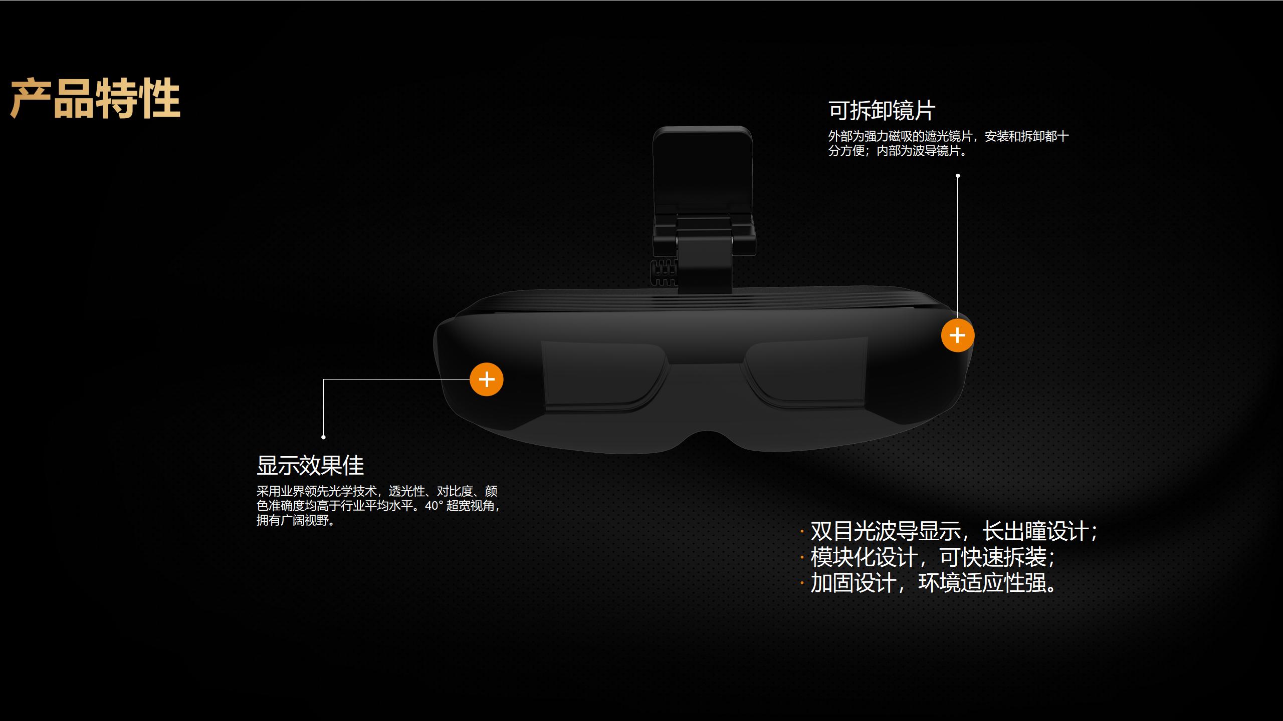 双目光波导显示,长出瞳设计,采用业界领先光学技术,透光性、对比度、颜色准确度均高于行业平均水平;